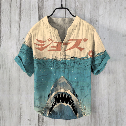 Men's Jaws Distressed Japanese Art Print Linen Henley Collar T-Shirt