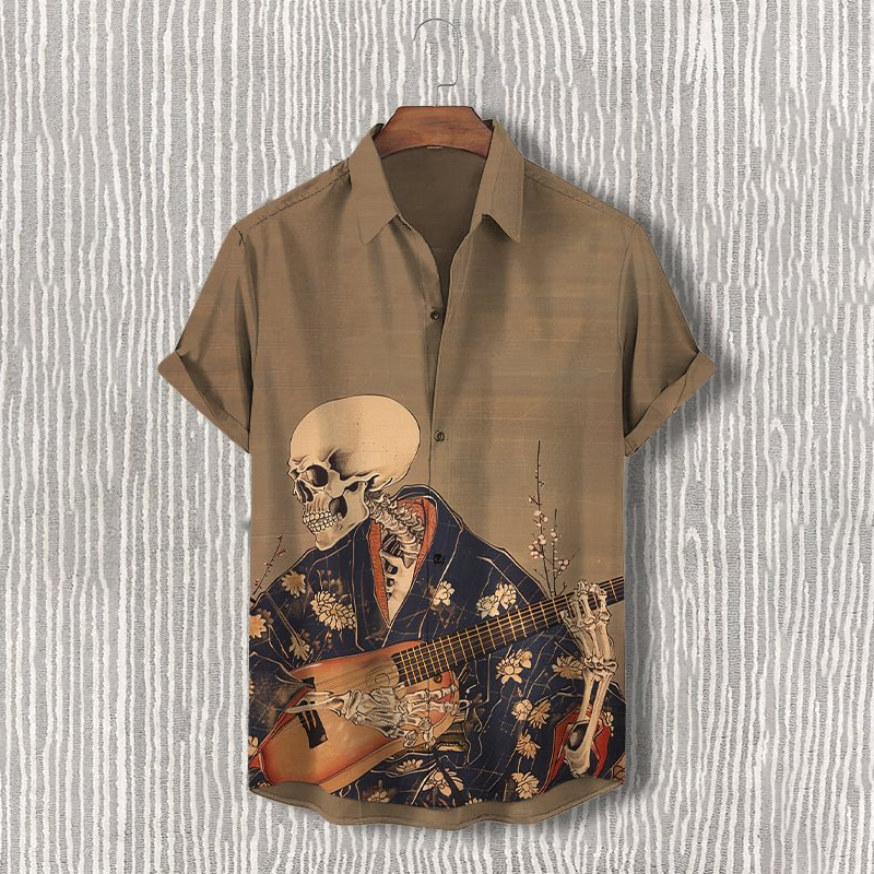 Men's Retro Japanese Art Painting Of Skull Playing Guitar Print Shirt
