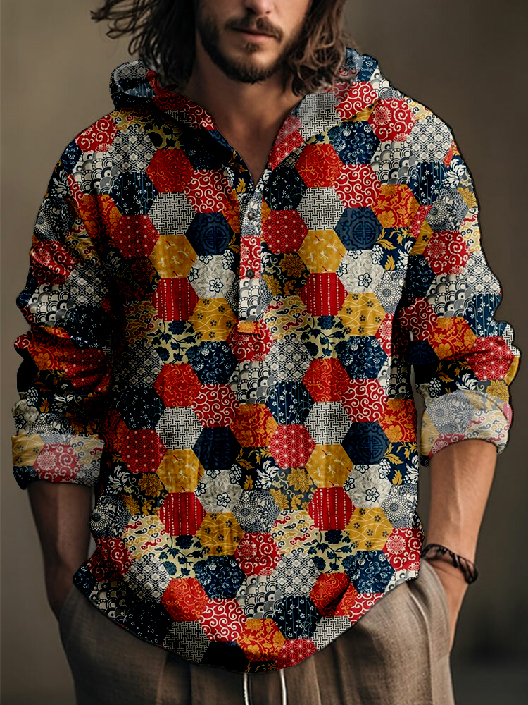 Traditional Japanese Patchwork Pattern Linen Blend Hooded Shirt
