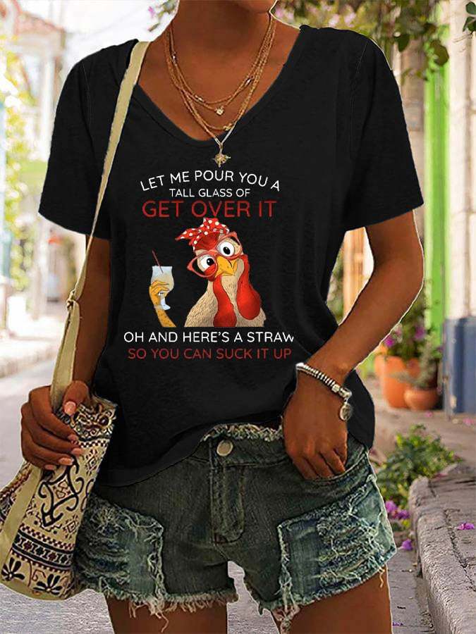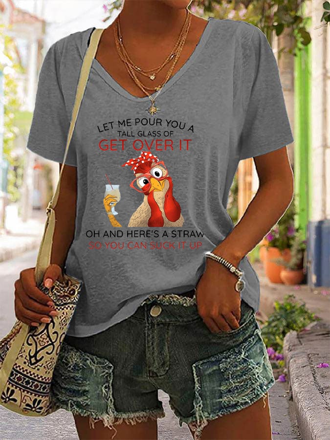 Women's Let Me Pour You A Tall Glass Of Get Over It Funny Chicken Print Casual T-Shirt