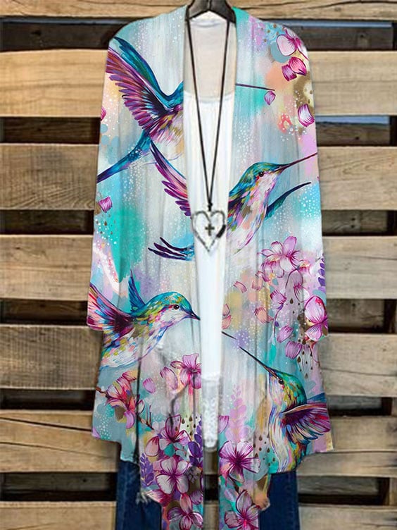 Women's Oil Painting Floral Hummingbird Print Cardigan