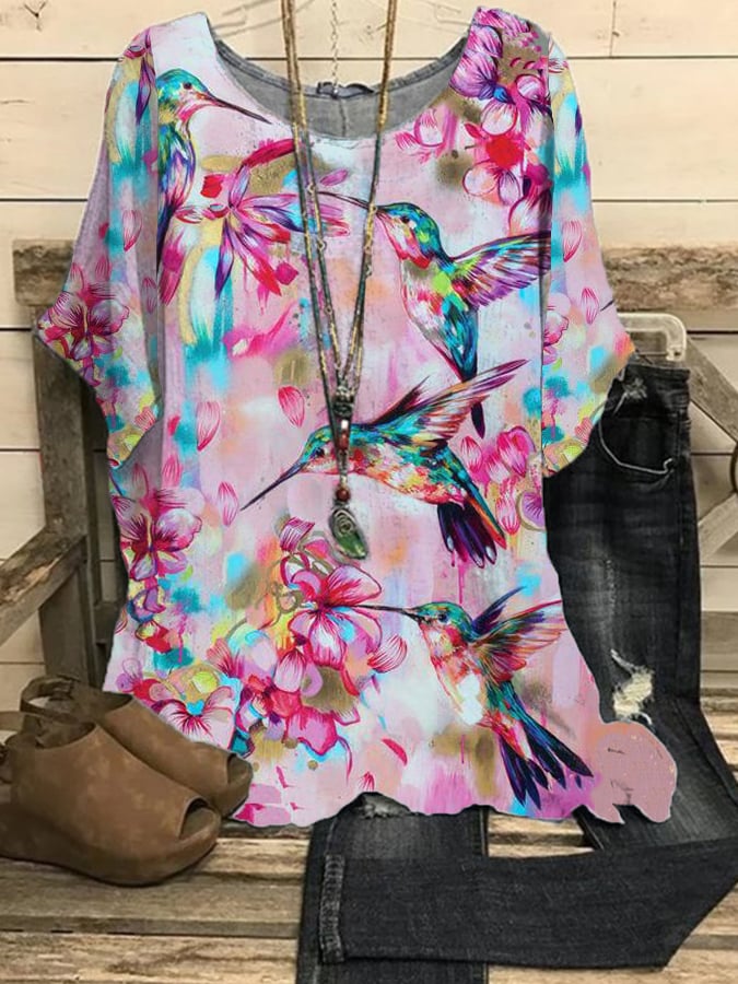 Women's Oil Painting Hummingbird Floral Print Crew Neck Top