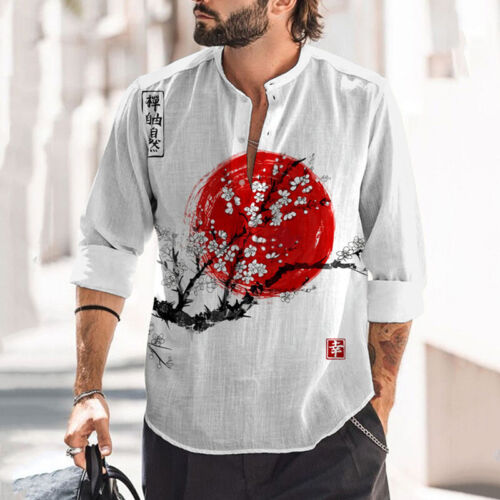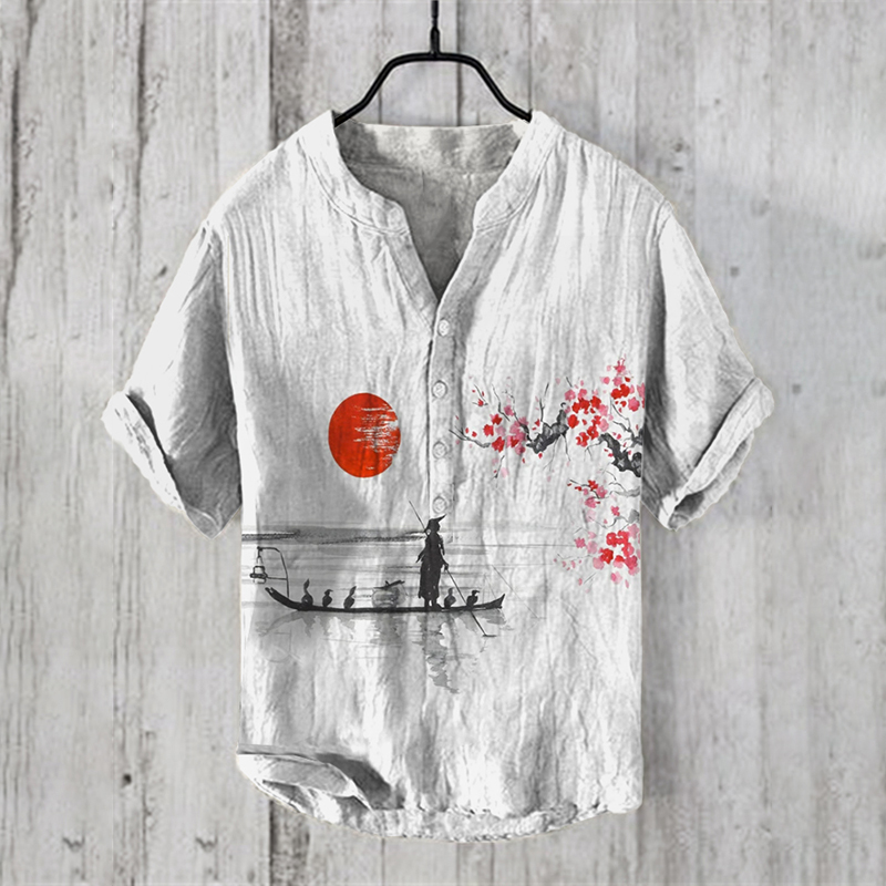 Men's Vintage Japanese Art Sakura Casual Linen Blend Shirt