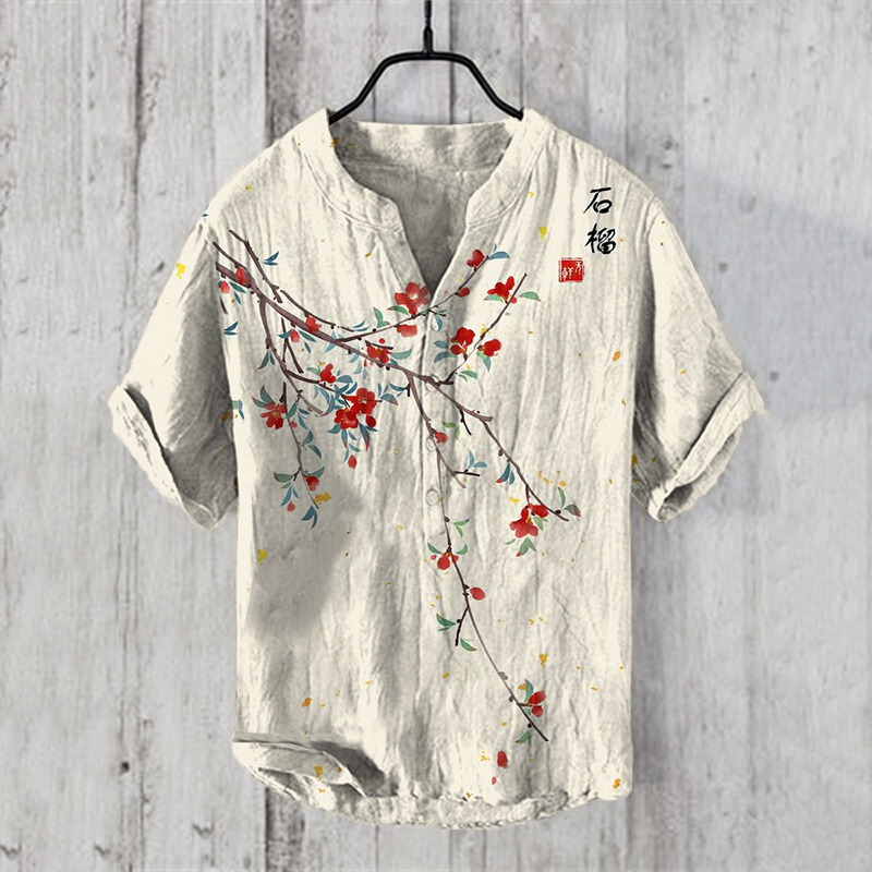 Men's Vintage Japanese Pomegranate V Neck Casual Linen Blend Shirt