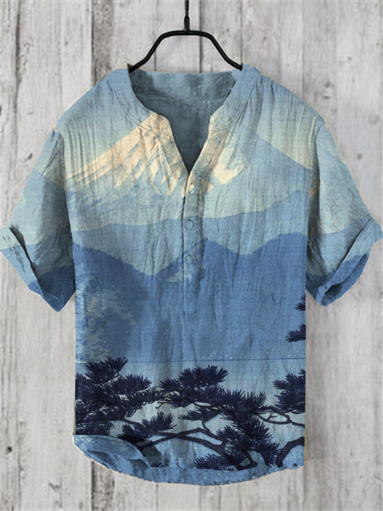Vintage Japanese Mount Fuji Landscape Art Linen Blend Shirt