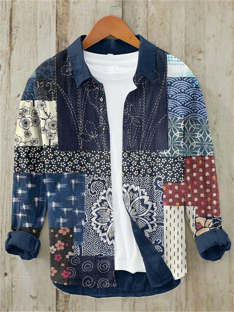 Men's Vintage Japanese Art Patch Casual Linen Blend Shirt