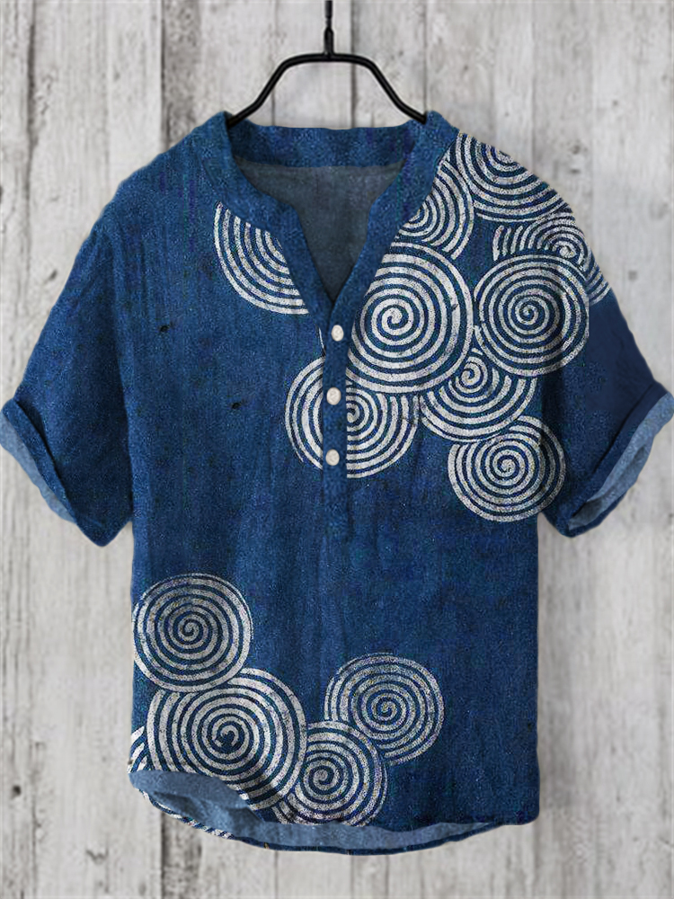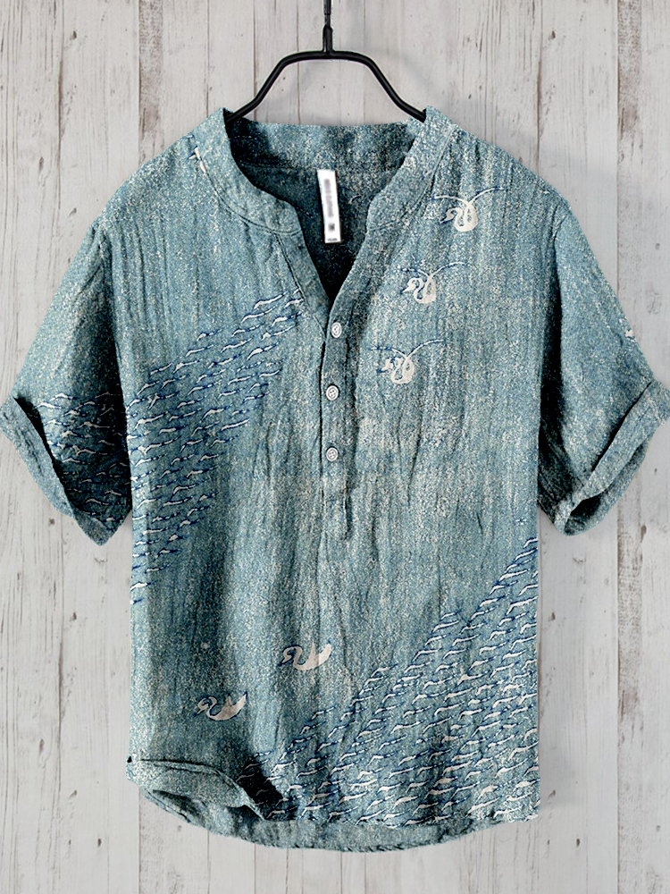 Japanese Waves Pattern Short Sleeve Linen Blend Shirt
