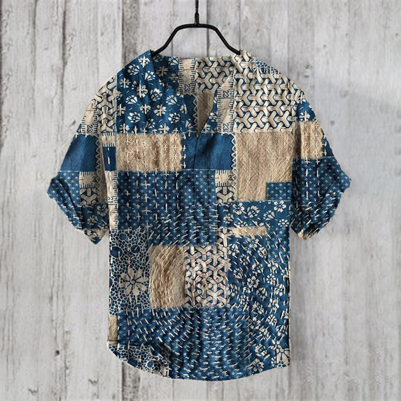 Traditional Japanese Patchwork Pattern Linen Blend Blouse