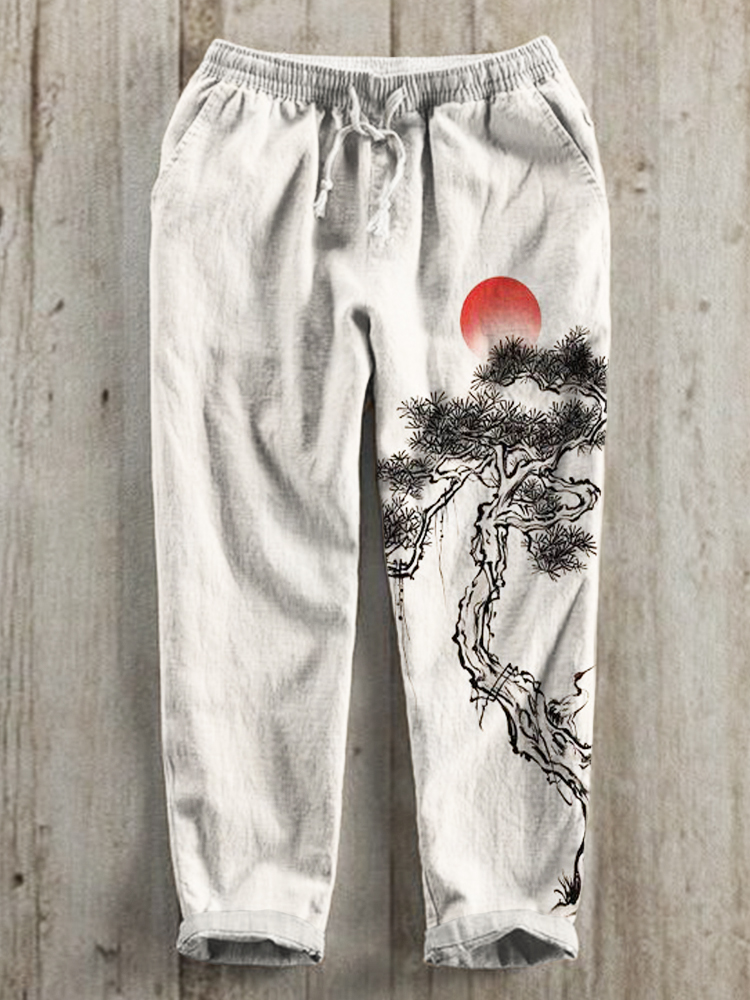 Ink and Pine Japanese Art Print Linen Drawstring Trousers
