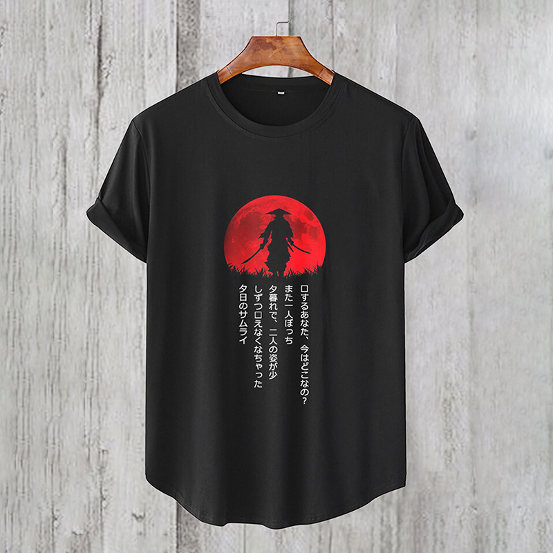 Red Sun Figure Japanese Print Curved Hem Short Sleeve T-Shirts