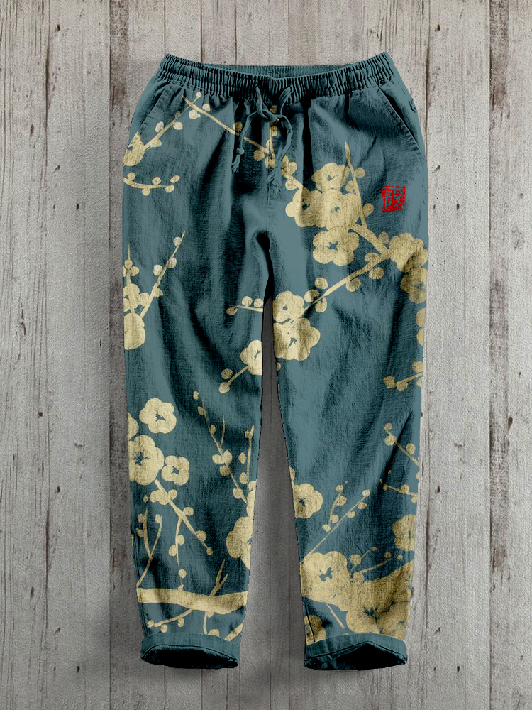 Japanese Plum Blossom Art Linen Blend Casual Pants