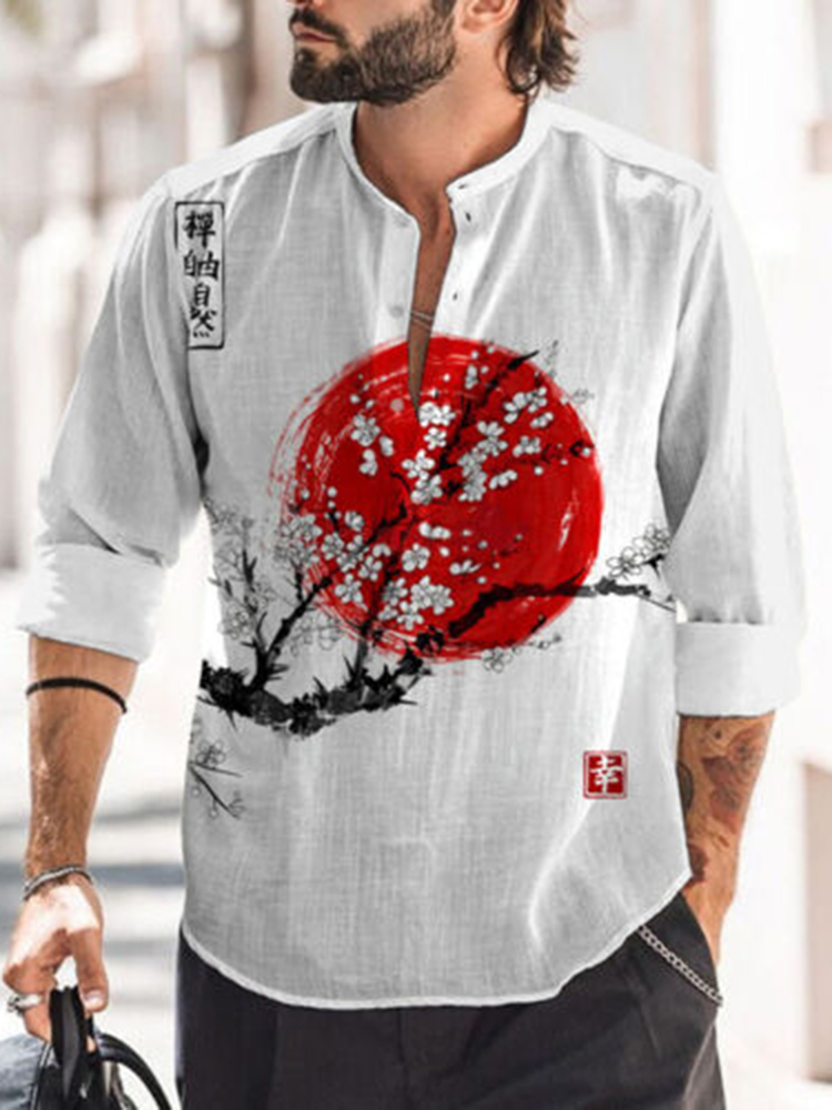 Mens Floral Sunrise Ink Print Linen Half Button Henley Shirts