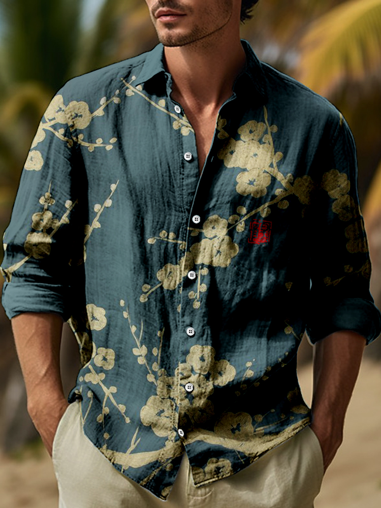 Japanese Plum Blossom Art Linen Blend Comfy Blouse