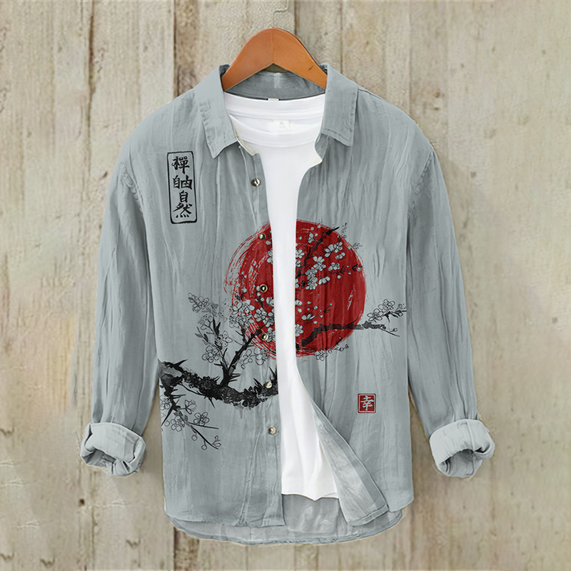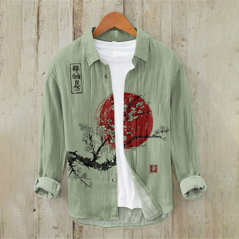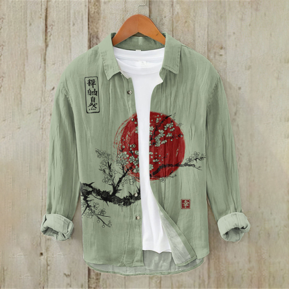 Men's Vintage Japanese Art Sunrise Casual Linen Blend Shirt