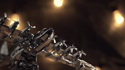 This eight-engine model. The aircraft is powered by the mechanical clockwork of the base. The specially designed gear set drives all propellers to rotate at the same time. The aircraft can be removed from the base.