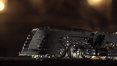 Steampunk style train. It has an aerodynamic shape and is driven by a metal clockwork. Equipped with a 24 mm wide track. The movements of internal gears and flywheels can be observed from the top and sides, and the coal car at the rear of the locomotive can be freely disassembled.