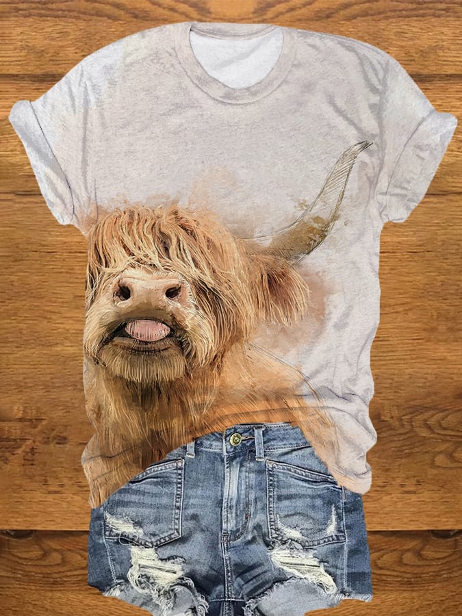 Women's Funny Face Style West Highland Cow Print Round Neck T-Shirt