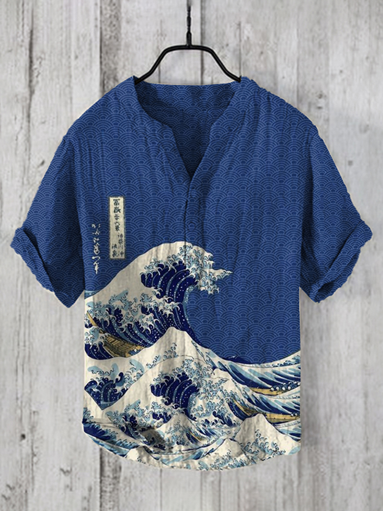 Men's Vintage Japanese Art Sea Wave V Neck Casual Linen Blend Shirt
