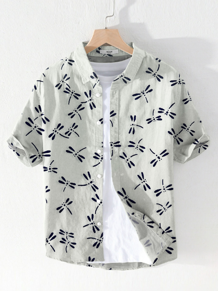 Dragonfly Printed Linen Casual Short Sleeve Shirt