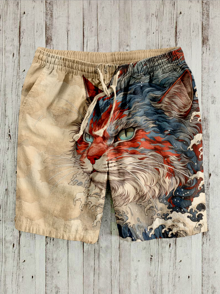 Japanese Great Wave Inspired Mysterious Cat Art Linen Blend Shorts