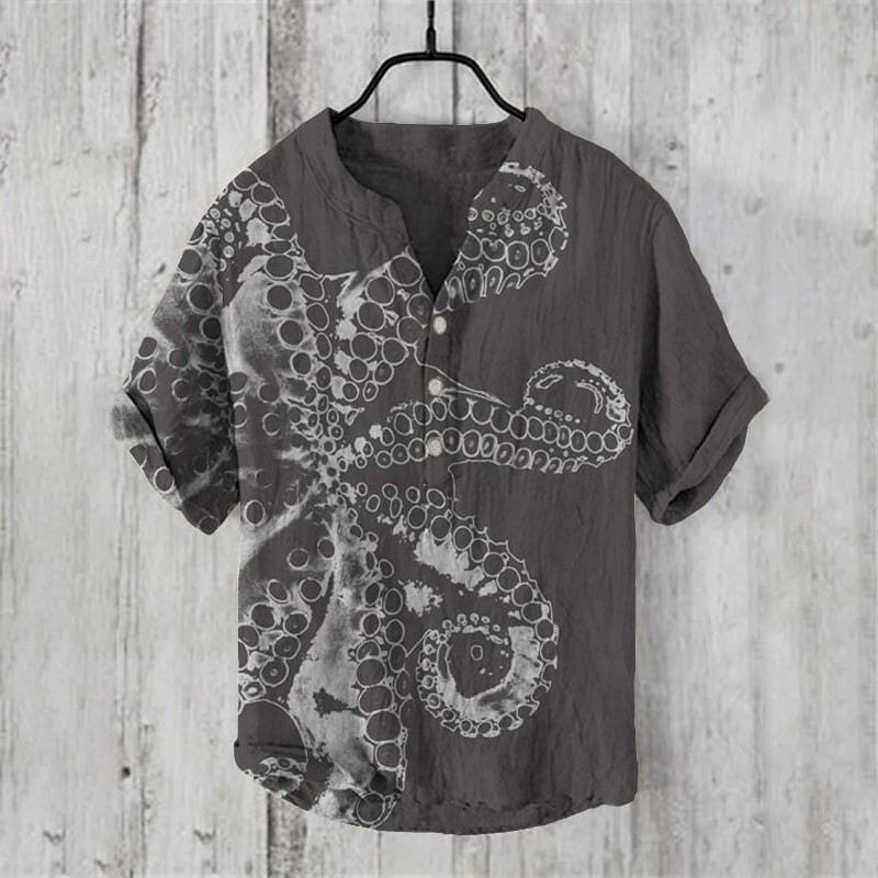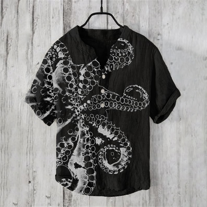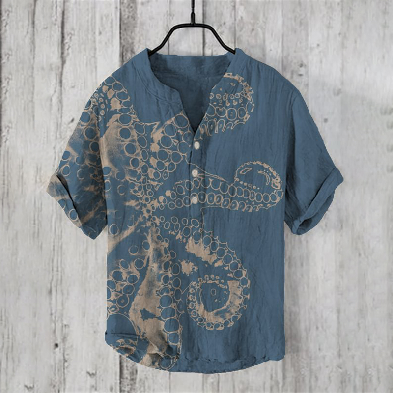 Japanese Retro Octopus Tentacles Print Linen Blend Cozy Shirt