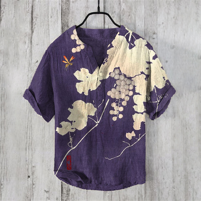 Men's Vintage Japanese Art V Neck Casual Linen Blend Shirt