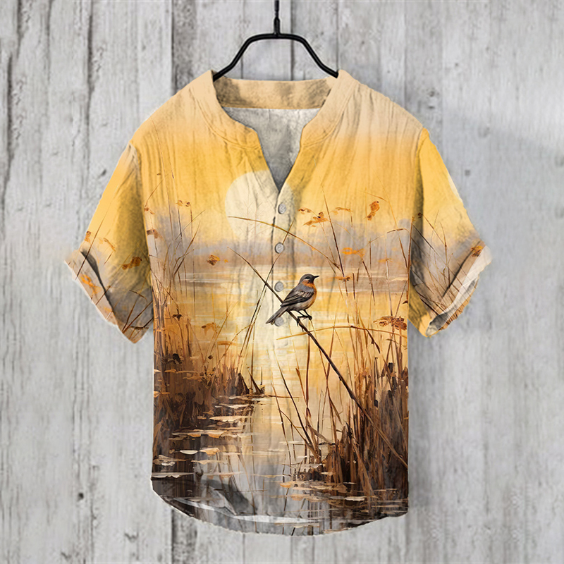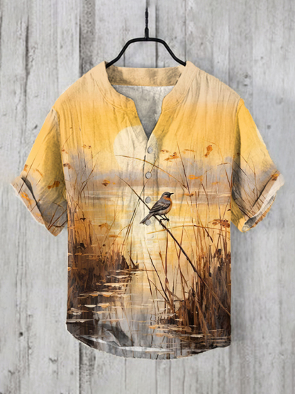Vintage Lake Sunrise Bird Scene Print V Neck Short Sleeve Shirt