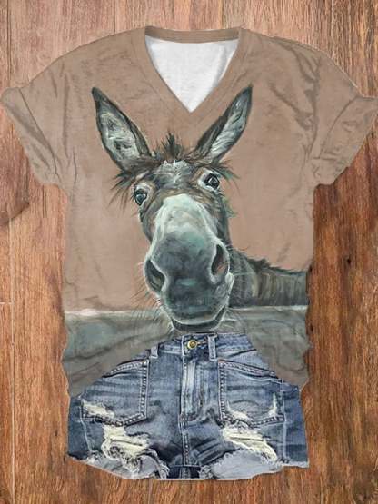 Women's Funny Donkey Print Casual V-Neck Tee