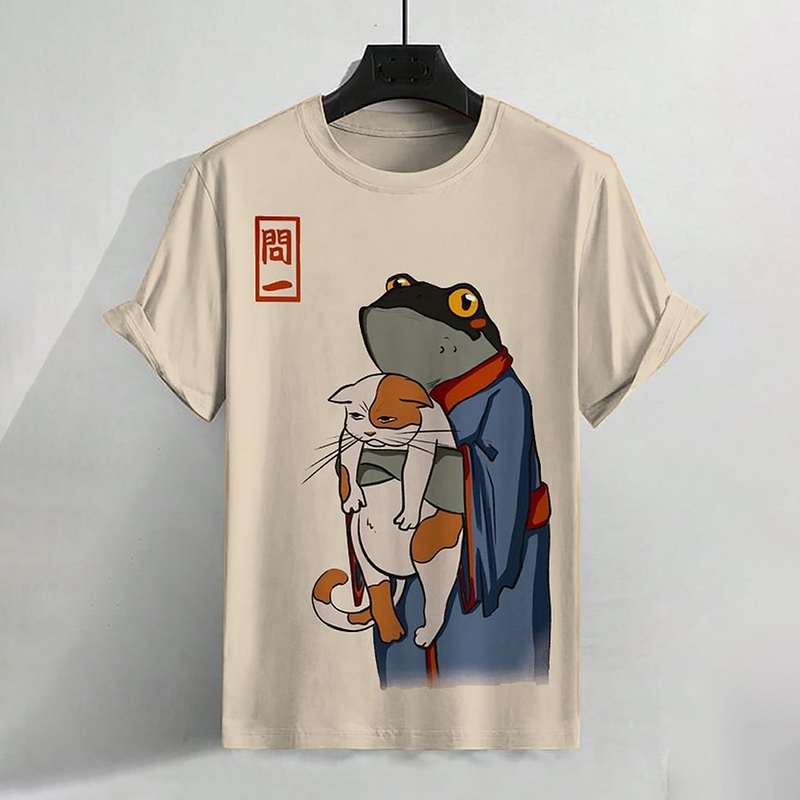 Men's Retro Japan Frog In Kimono And Unhappy Cat Print T-Shirt