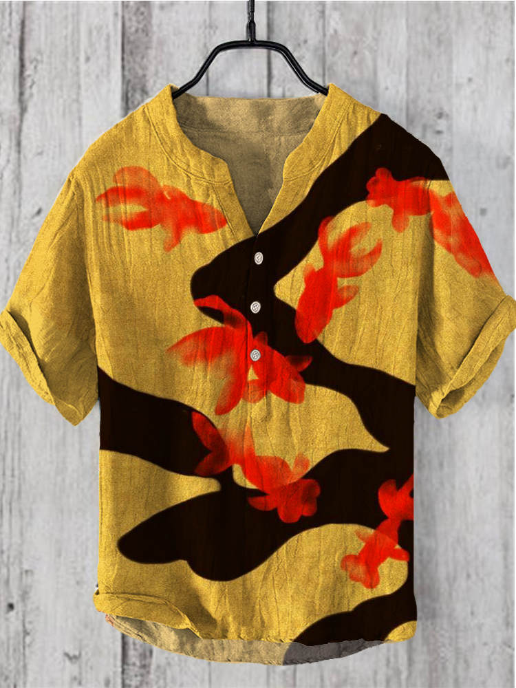 Red Goldfish Japanese Art Linen V-Neck Shirt