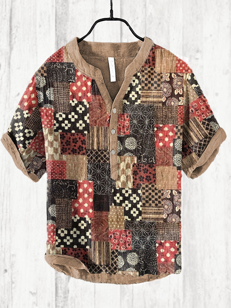 Vintage Japanese Art Patchwork Cozy Cotton Linen Shirt