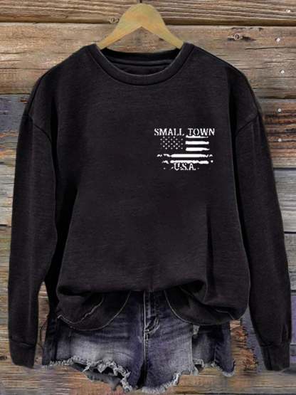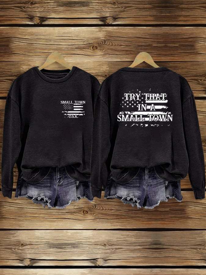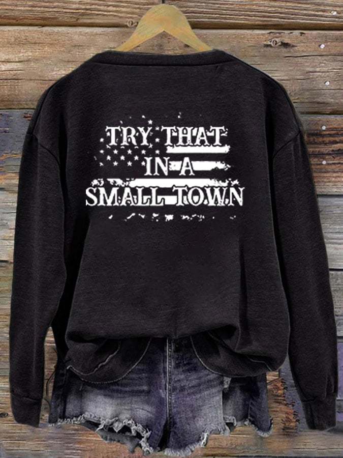 Women's Small Town USA American Flag Try That In A Small Town Printed Round Neck Long Sleeve Sweatshirt
