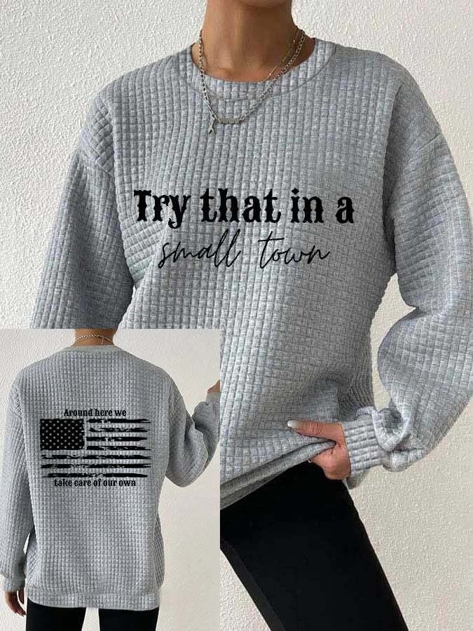 Women's Try That In A Small Town American Flag Print Waffle Sweatshirt