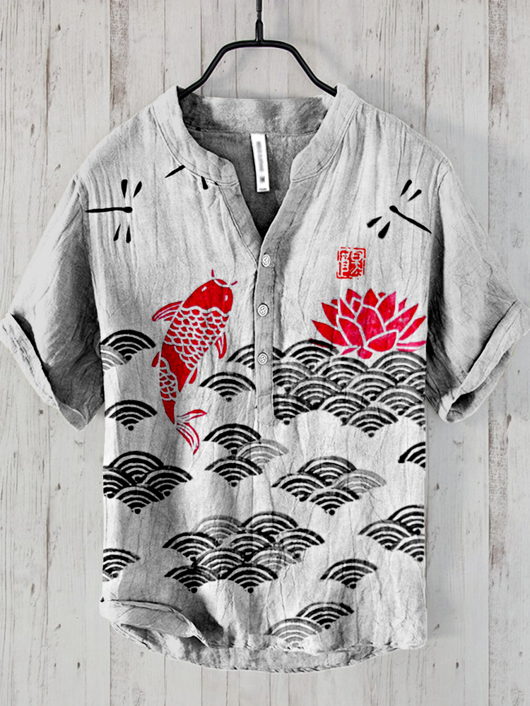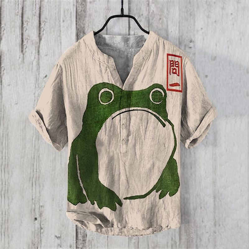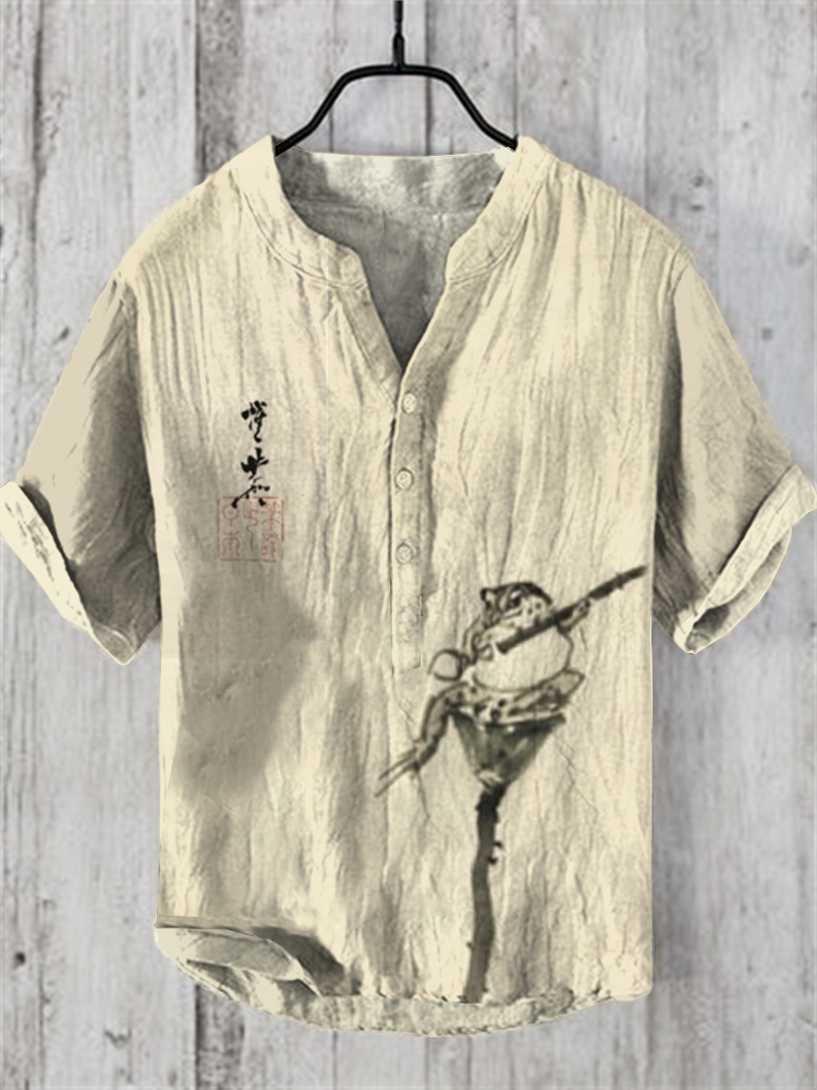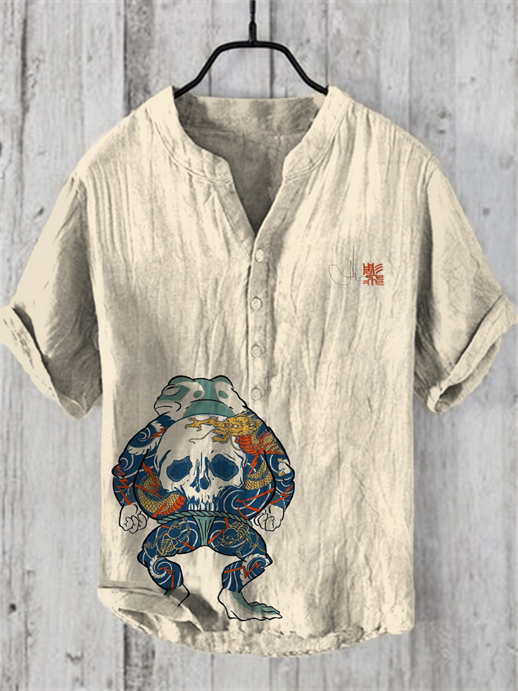 Men's Retro Ocean Japanese Art Tattooed Frog Linen Henry Collar Shirt