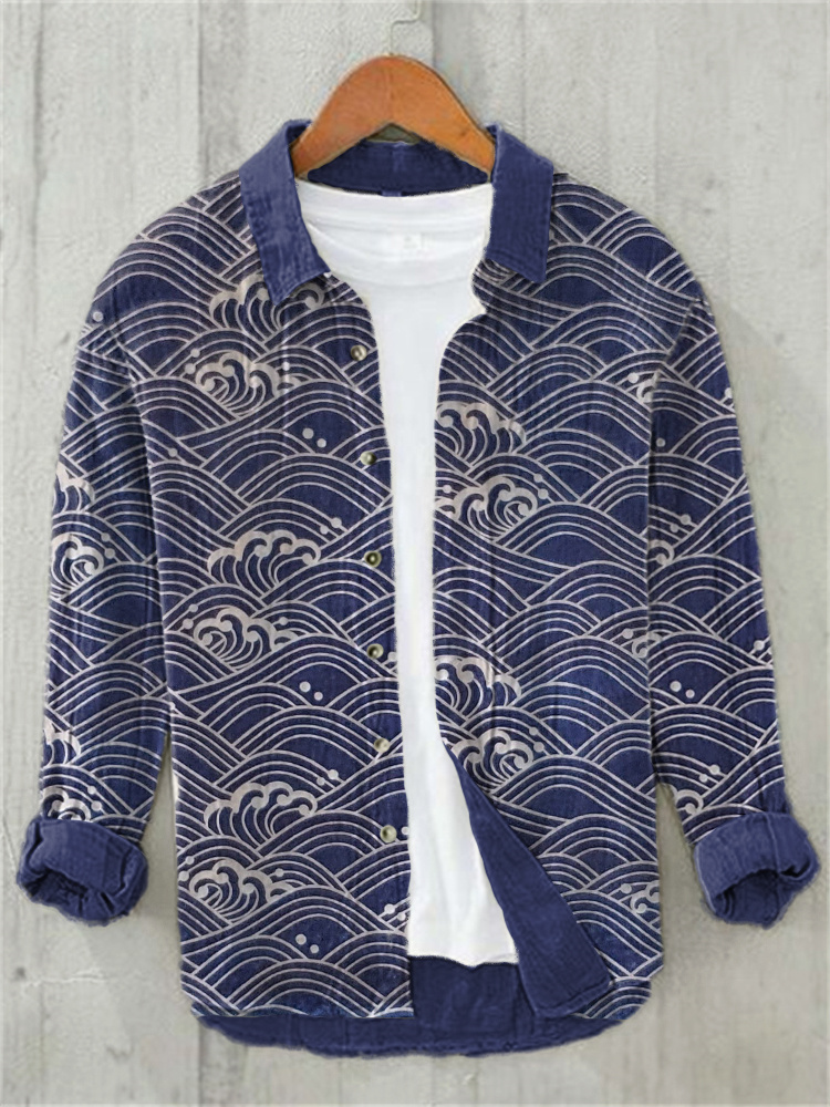 Japanese Art Waves Pattern Cozy Cotton Linen Long-Sleeve Shirt