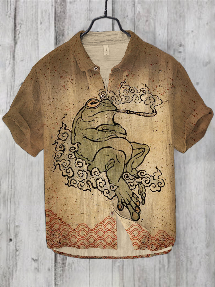 Japanese Pipe Frog Vintage Print Casual Linen Shirt