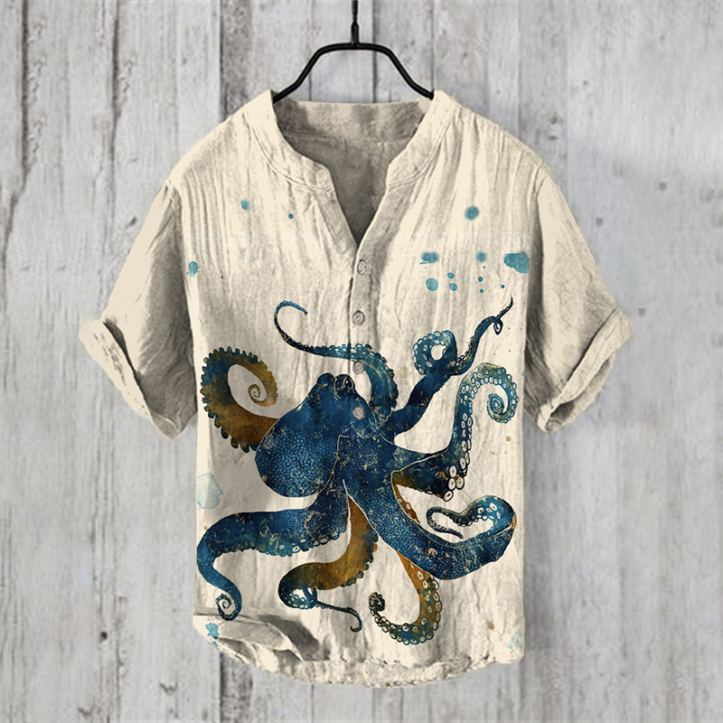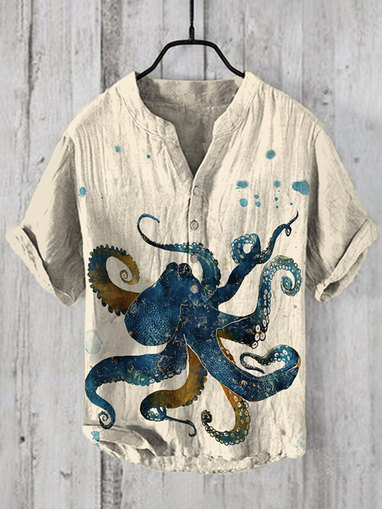 Japanese Blue Octopus Water Stained Art Linen Blend Shirt