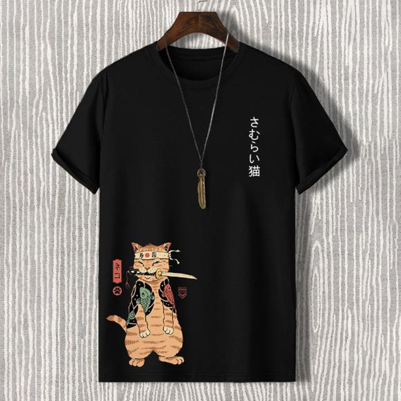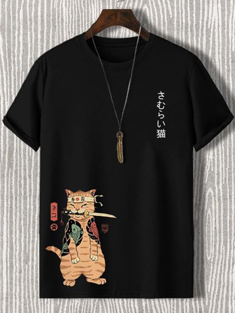 Men'S Japanese Sushi Samurai Cat Print Casual T-Shirt