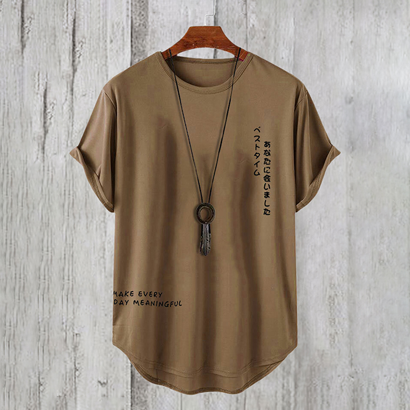 Japanese Letter Print Curved Hem Casual Short Sleeve T-Shirts
