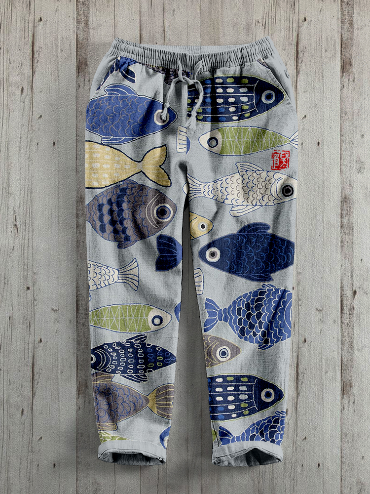 Vintage Fish Japanese Art Linen Blend Casual Pants