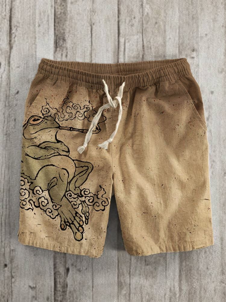 Japanese Pipe Frog Vintage Print Linen Shorts