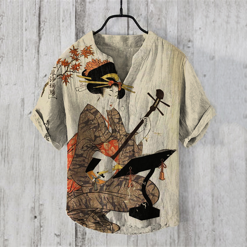Men's Vintage Geishas Japanese Art Art Linen Blend Shirt