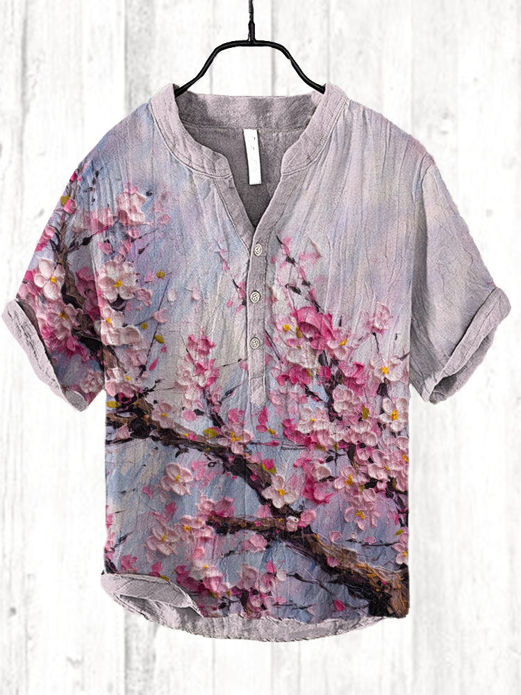 Japanese Cherry Blossoms Oil Painting Print Cozy Cotton Linen Shirt