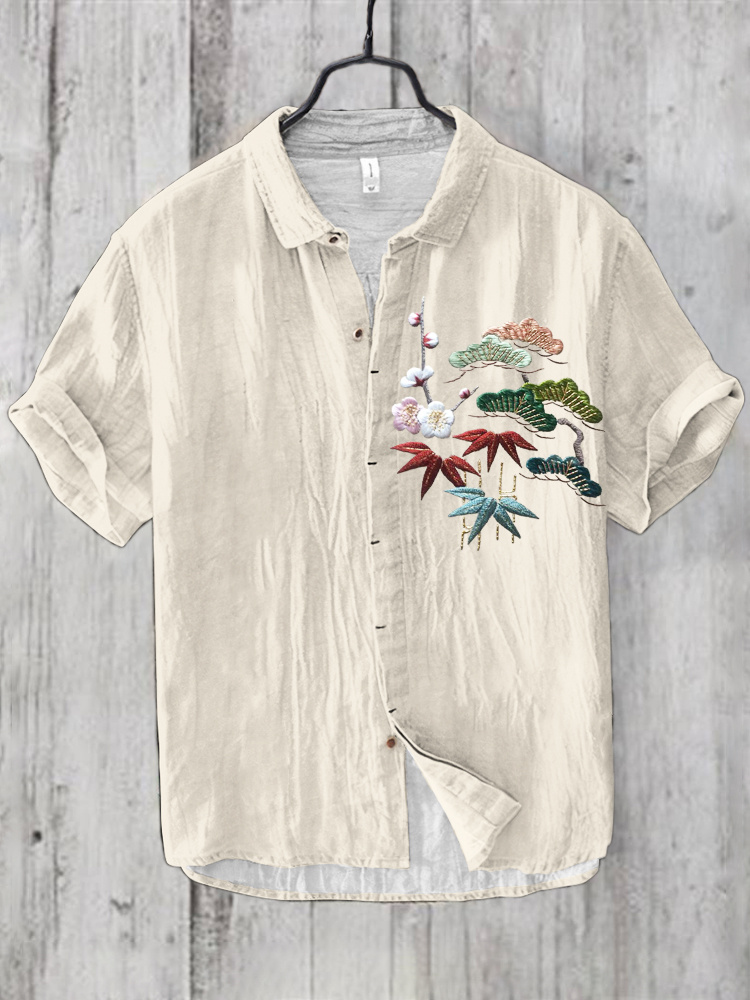 Botanical Flower Embroidery Japanese Art Linen Short Sleeve Shirt