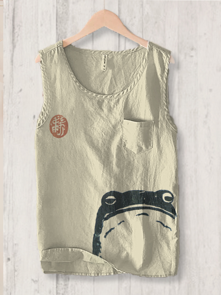 Japanese Art Frog Print Cozy Cotton Linen Vest