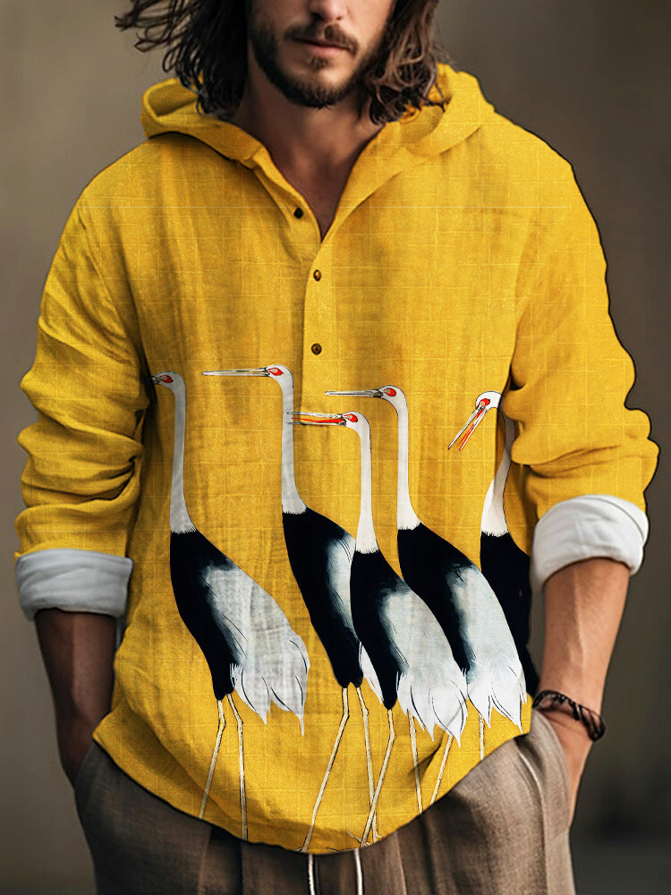 Crane Japanese Art Print Linen Hooded Long Sleeve Shirt