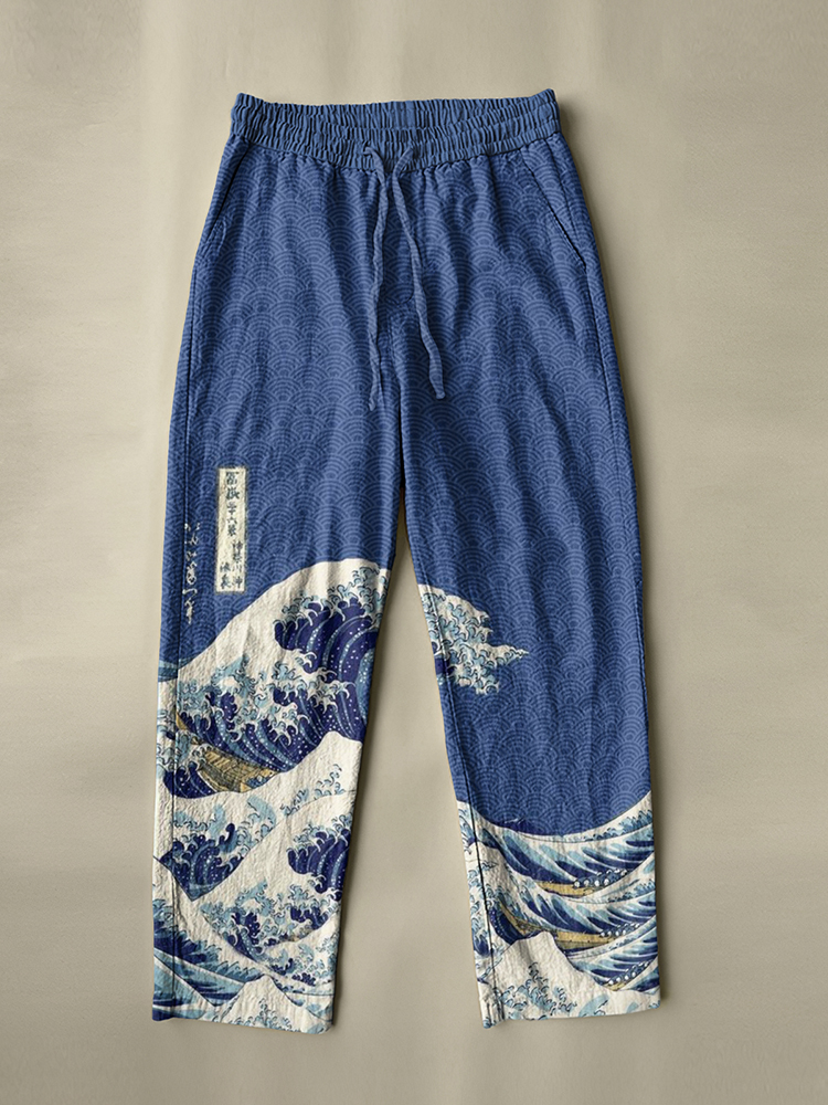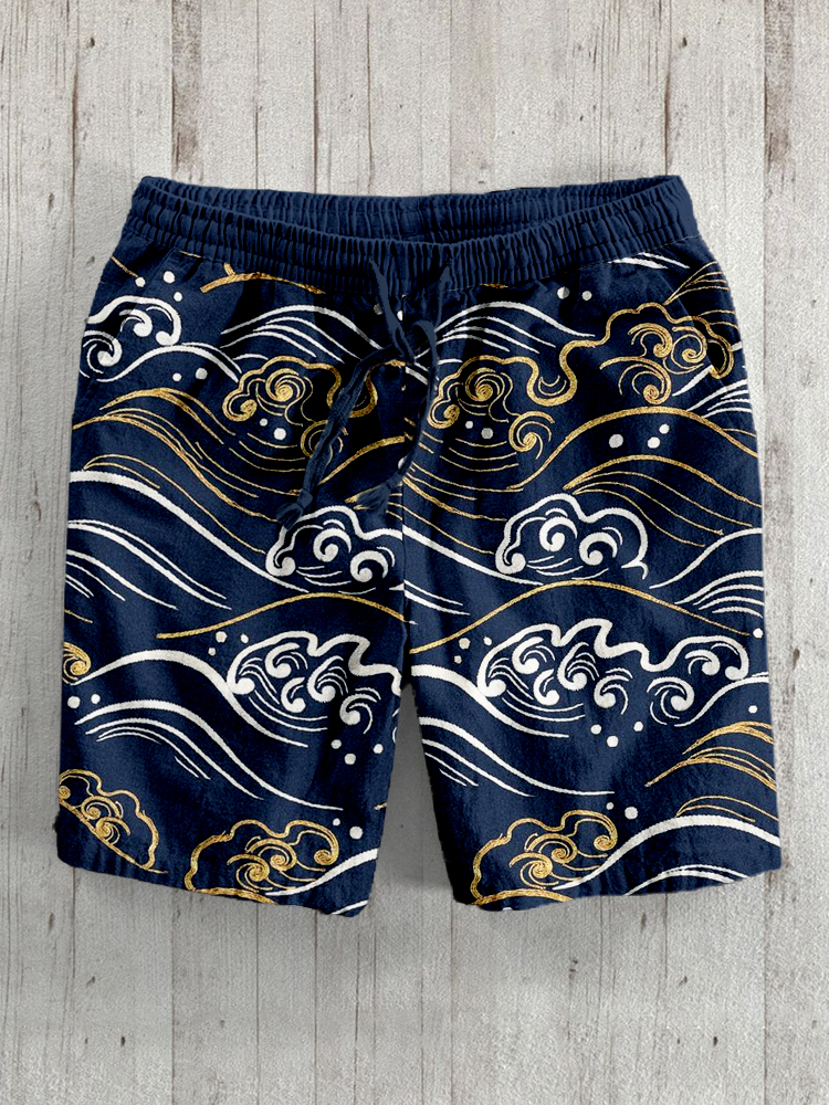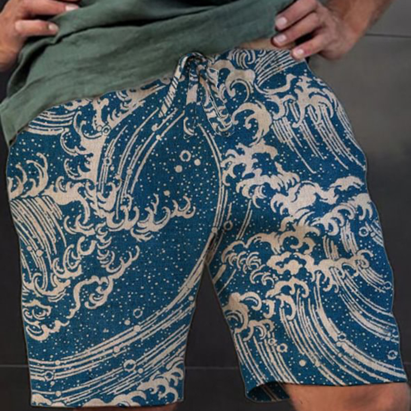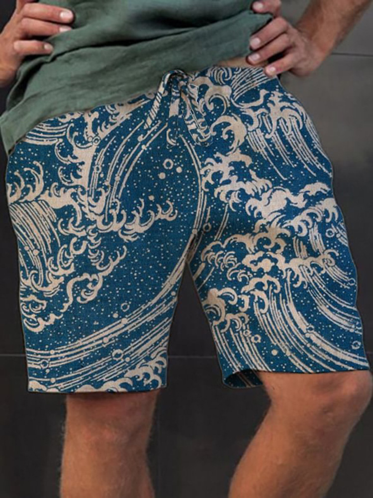Japanese Ocean Waves Pattern Linen Blend Shorts