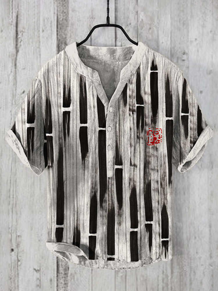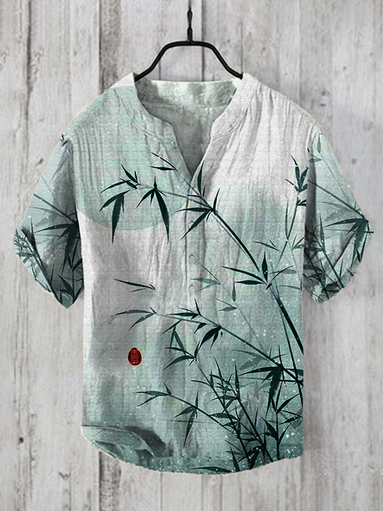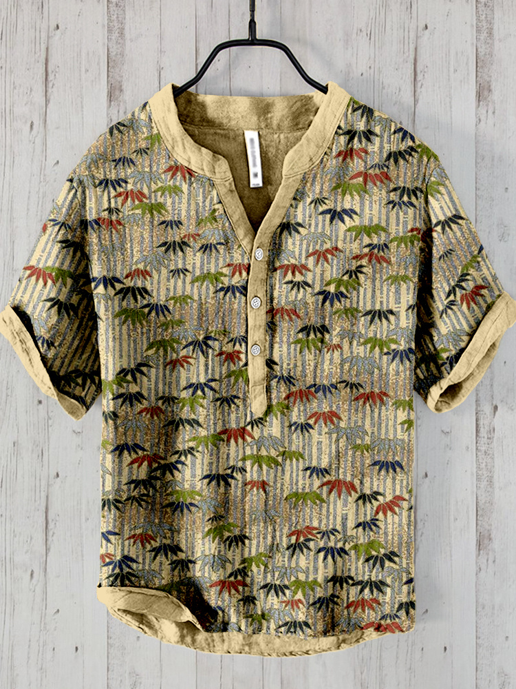 Men's Vintage Japanese Art Bamboo Leaf V Neck Casual Linen Blend Shirt