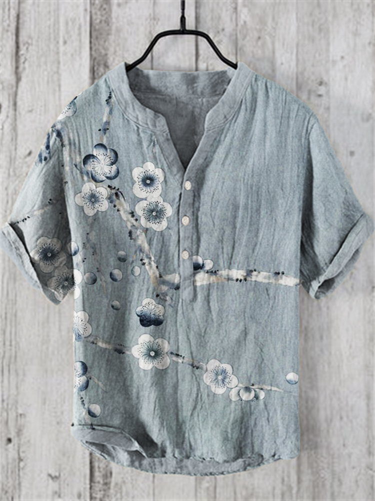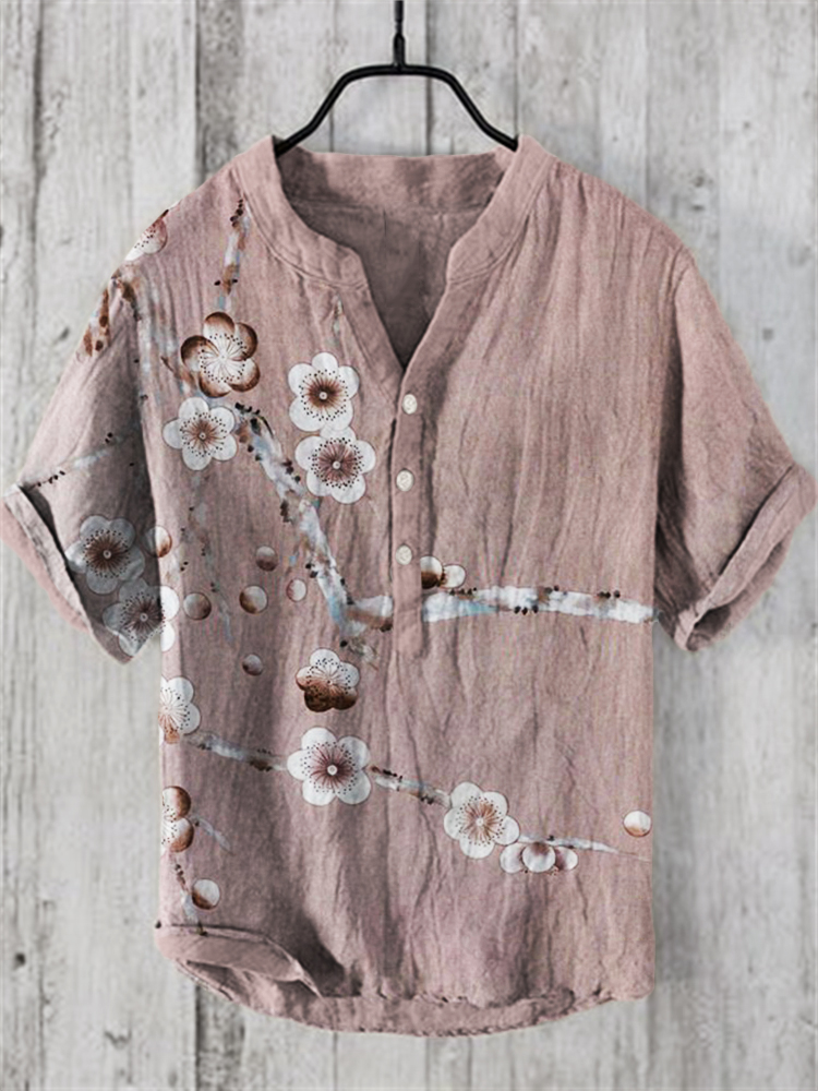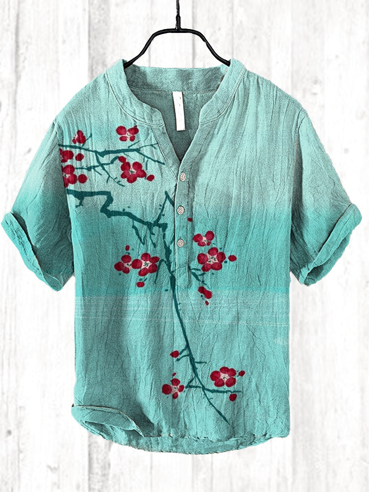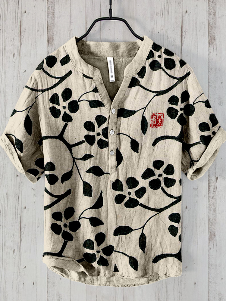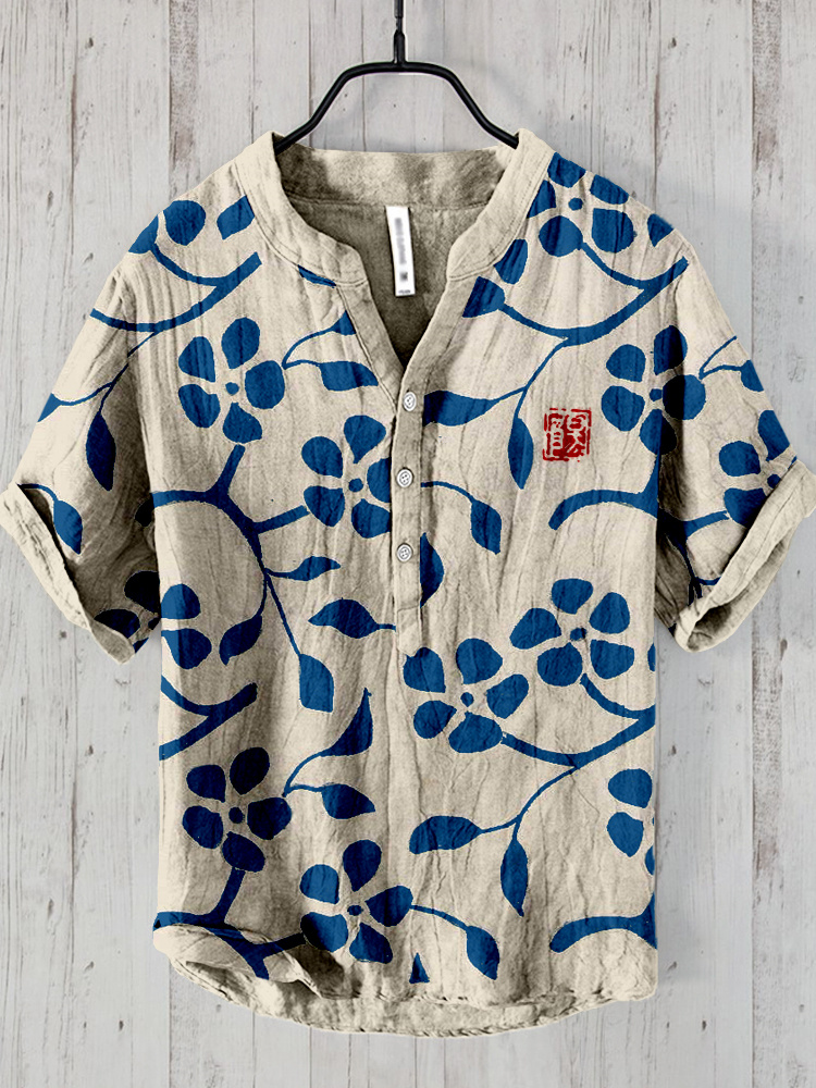 Japanese Floral Art Print Cozy Cotton Linen Shirt