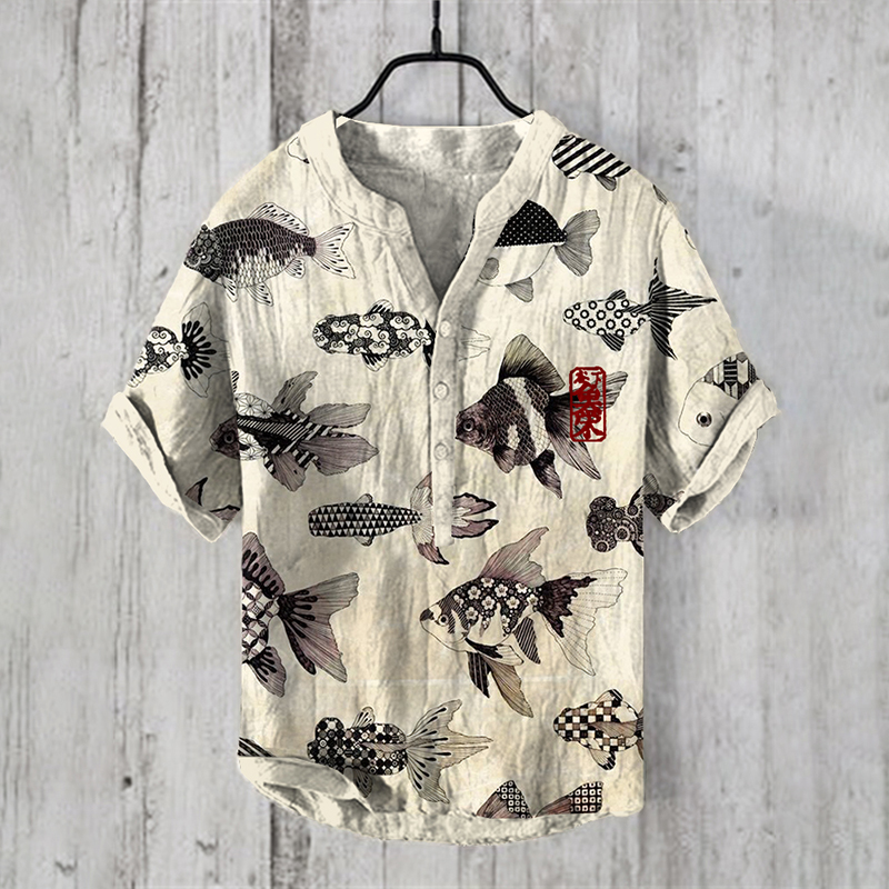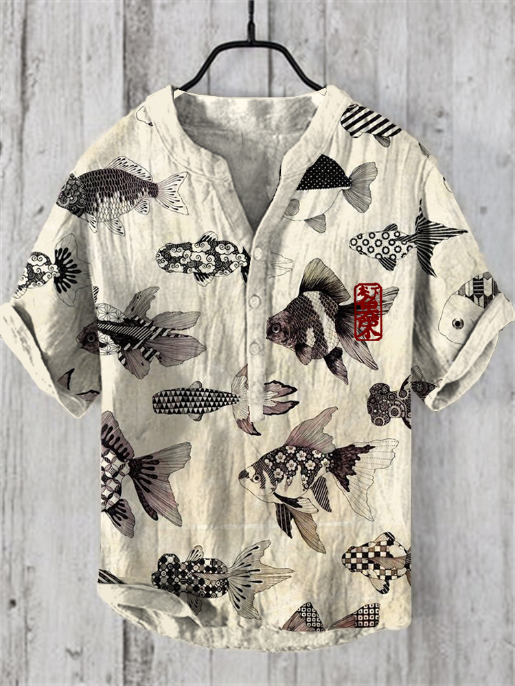 Vintage Fish Japanese Art Linen Blend Casual Shirt